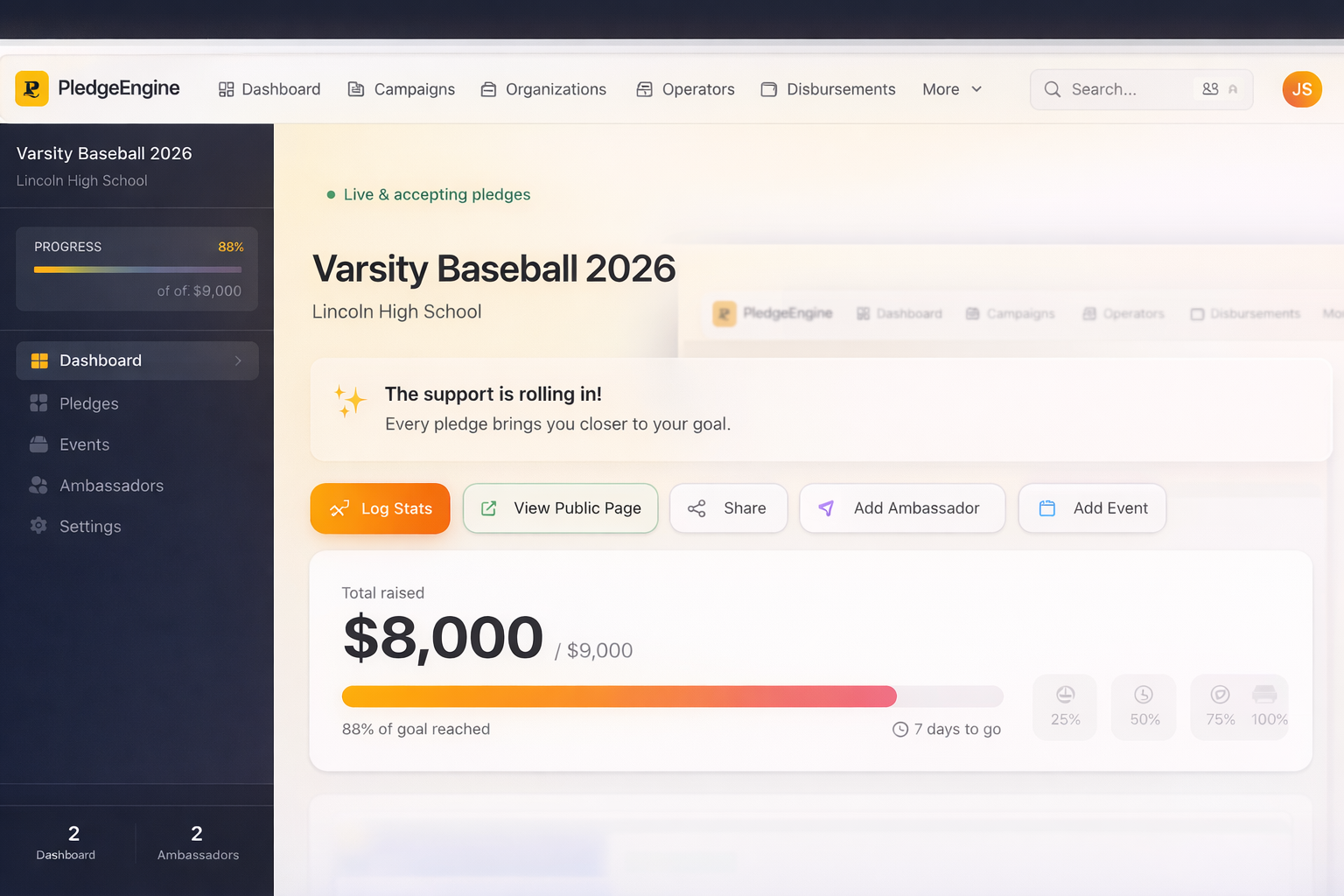 Operator campaign dashboard. Manage multiple schools, seasons, and payouts in one place.